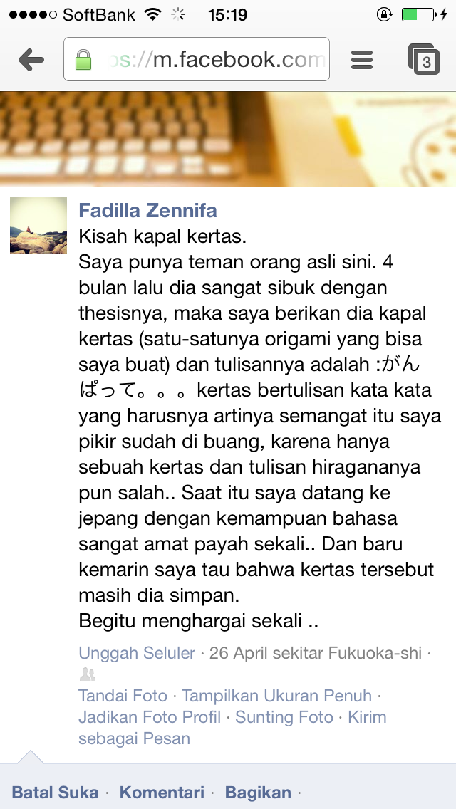 Sebagai orang yang suka iseng, kawanku itu sering ku usik. aku berbicara tentang mimpi padanya, bercerita bahwa dia juga bisa study abroad. berkata bahwa dia harus yakin kalau dia bisa. Suatu hari kuberikan dia origami perahu kertas. seperti yang terlihat di foto itu,
