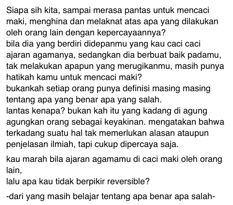 begini saja, saya sebenarnya sudah merasa jengah dan mual, melihat timeline berserakan dengan tulisan tulisan atau isi berita hoax hingga pelecehan terhadap agama. Maka dengan itulah saya termotivasi untuk mengajak kita merenung..