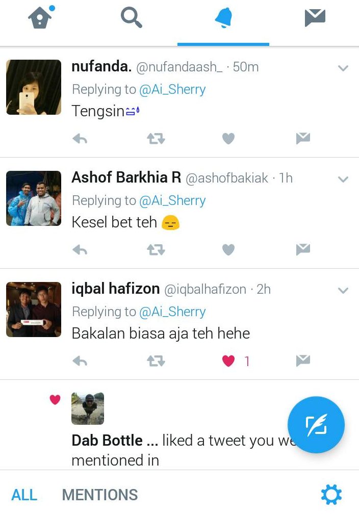 Ai : Dulu pertama kali masuk ke grup chat ya kesel, sempat mikir, apa pada ga suka sama aku? sekarang mah nyuekin. Kalau dicuekin yaudah, berarti ada dua kemungkinan : mereka ga tertarik, mereka lupa bales.