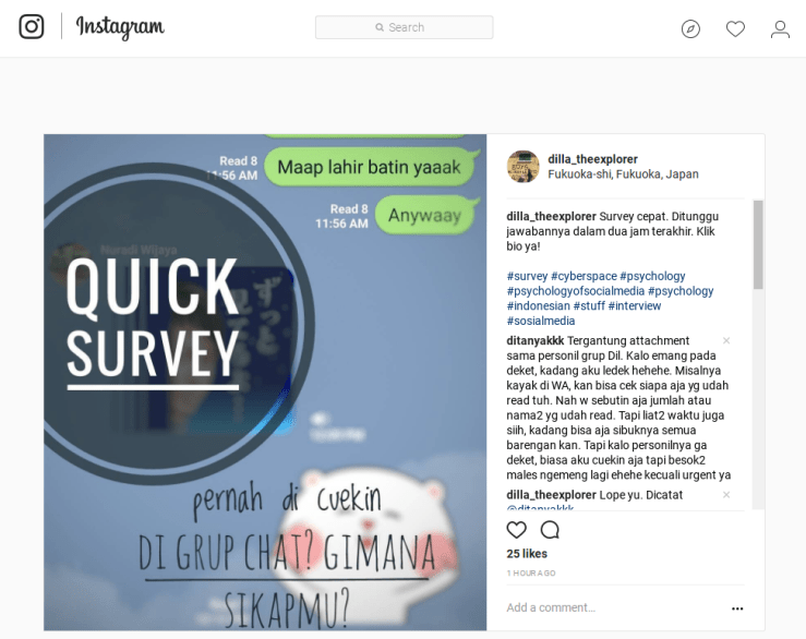 Berdasarkan hal tersebut, penulis mencoba melakukan survey dengan menggunakan beberapa sosial media, Instagram, Line, dan whatsapp dibantu dengan form “google form” dengan durasi 1,5 jam.