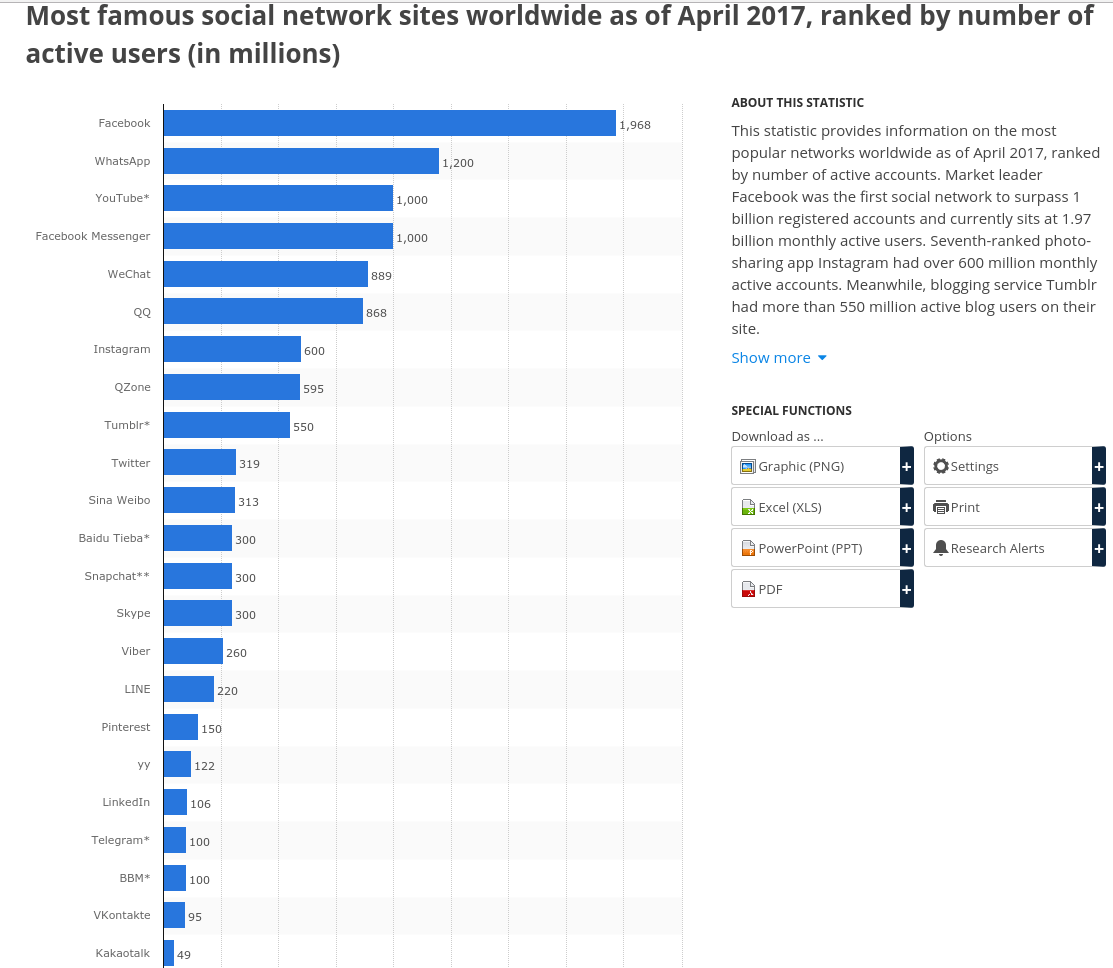 Berhubung dilanda rasa penasaran, berbekal senjata referensi dari link yang terdapat di wikipedia maka penulis menampilkan grafik “most famous social network sites worldwide as of april 2017, ranked by number of active users (in milions). Cukup membuat terbelalak, saat kemarin penulis mengaktifkan akun facebook penulis dan melihat pernyataan terimakasih dari facebook karena telah menjadi salah satu pengguna akun facebook diantara 2 miliar pengguna lainnya. Marketing yang luar biasa ya! Ada 7 miliar penduduk bumi dan 2 miliar diantaranya adalah pengguna Facebook. Yaudah, ciao kalau gitu penulis minggat dari Facebook. Takut terciduqh soalnya.
