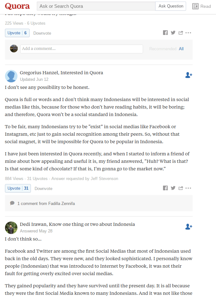 Ya, ketika penulis kabur dari dunia facebook, penulis melanjutkan hobi berburu informasi di website yang bernama quora.com dan benar sekali, pada saat ini belum banyak penggunanya yang berasal dari Indonesia. Mengenai pertanyaan tersebut, ada jawaban yang menarik dari 19 responden yang menjawab.