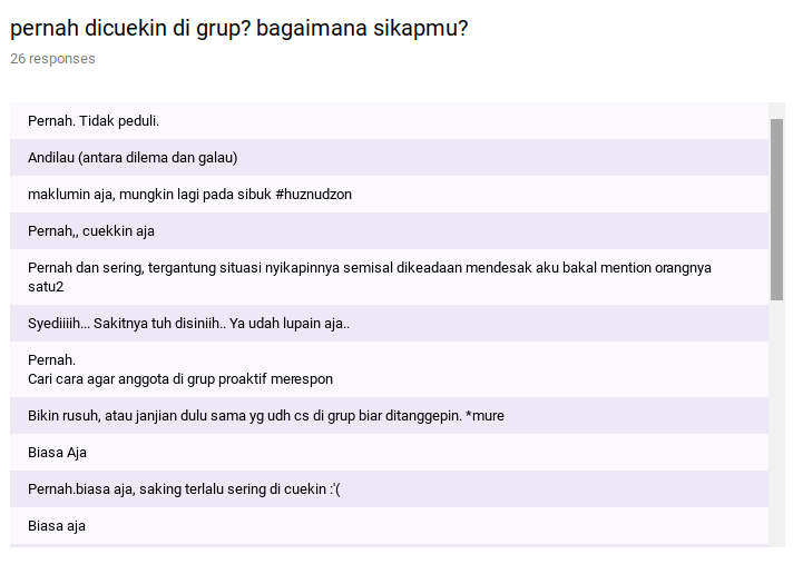 Ya, berhubung survey yang penulis lakukan adalah survey cepat, maka di survey tersebut penulis hanya menanyakan “pernah dicuekin di grup? bagaimana sikapmu?”