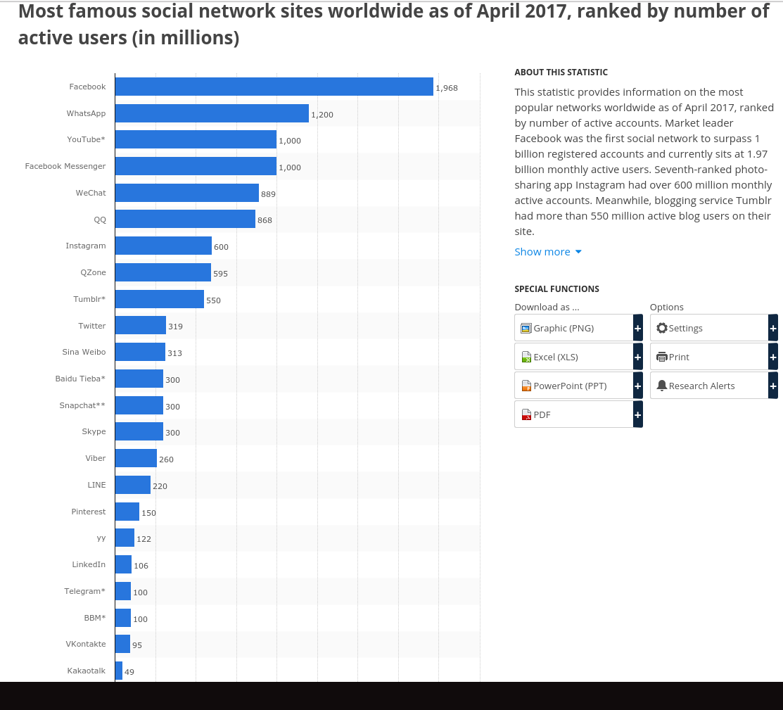 Berhubung dilanda rasa penasaran, berbekal senjata referensi dari link yang terdapat di wikipedia maka penulis menampilkan grafik “most famous social network sites worldwide as of april 2017, ranked by number of active users (in milions). Cukup membuat terbelalak, saat kemarin penulis mengaktifkan akun facebook penulis dan melihat pernyataan terimakasih dari facebook karena telah menjadi salah satu pengguna akun facebook diantara 2 miliar pengguna lainnya. Marketing yang luar biasa ya! Ada 7 miliar penduduk bumi dan 2 miliar diantaranya adalah pengguna Facebook. Yaudah, ciao kalau gitu penulis minggat dari Facebook. Takut terciduqh soalnya.