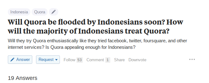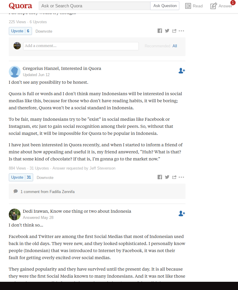 Ya, ketika penulis kabur dari dunia facebook, penulis melanjutkan hobi berburu informasi di website yang bernama quora.com dan benar sekali, pada saat ini belum banyak penggunanya yang berasal dari Indonesia. Mengenai pertanyaan tersebut, ada jawaban yang menarik dari 19 responden yang menjawab.