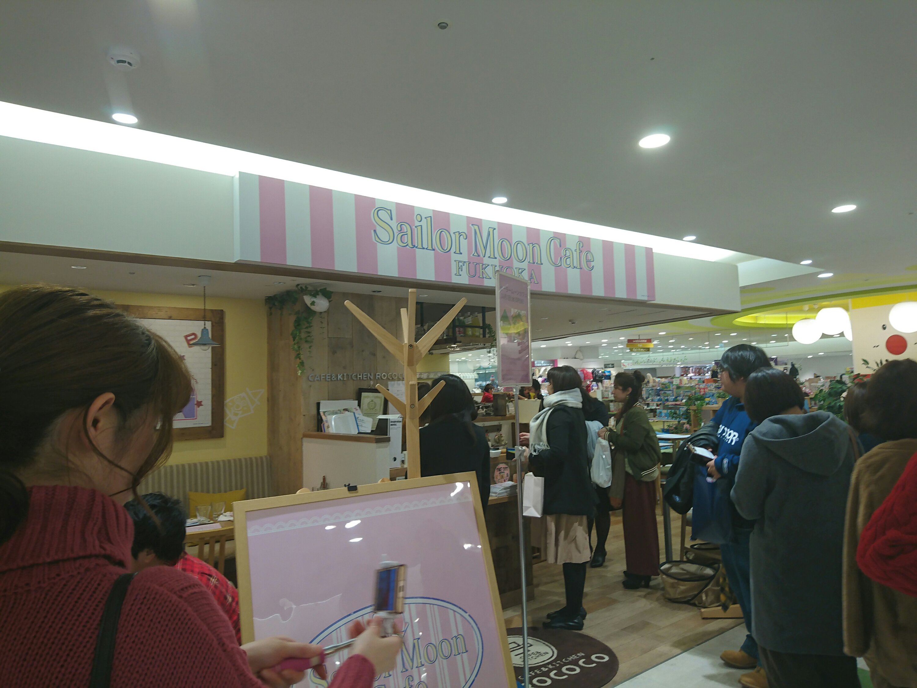 Kemudian setelah bertemu, kami berjalan kaki dari Nakasu Kawabata menuju Tenjin (5 menitan). Kafe “limited edition” ini berada di Daimaru mall. Setibanya kami di Kafe, ada banyak gadis 90-an yang mengantri dan foto-foto di depan kafe.