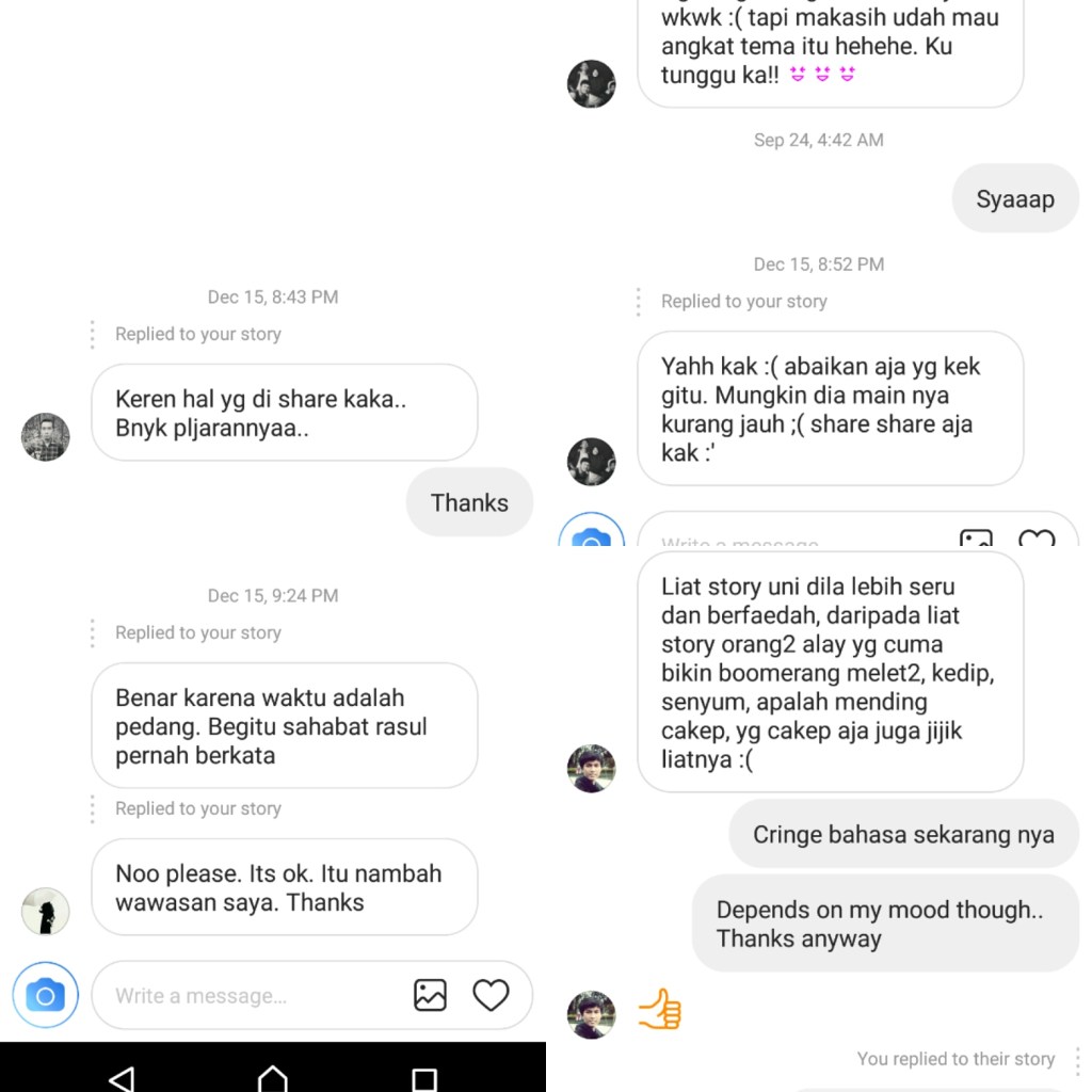 Semua orang emang pengennya diterima, tapi gak semua bakal terima kamu. Ingat itu anak muda. Bahkan walaupun tujuannya tidak menceritakan tentang DIRI SENDIRI, tetap saja persepsi orang lain tidak 100 persen sama dengan persepsi yang kita inginkan. Suatu hari saya pernah berbagi cerita tentang ke-disiplinan di Jepang, dan tanggapan salah seorang instastoriers adalah seperti di gambar berikut ini :